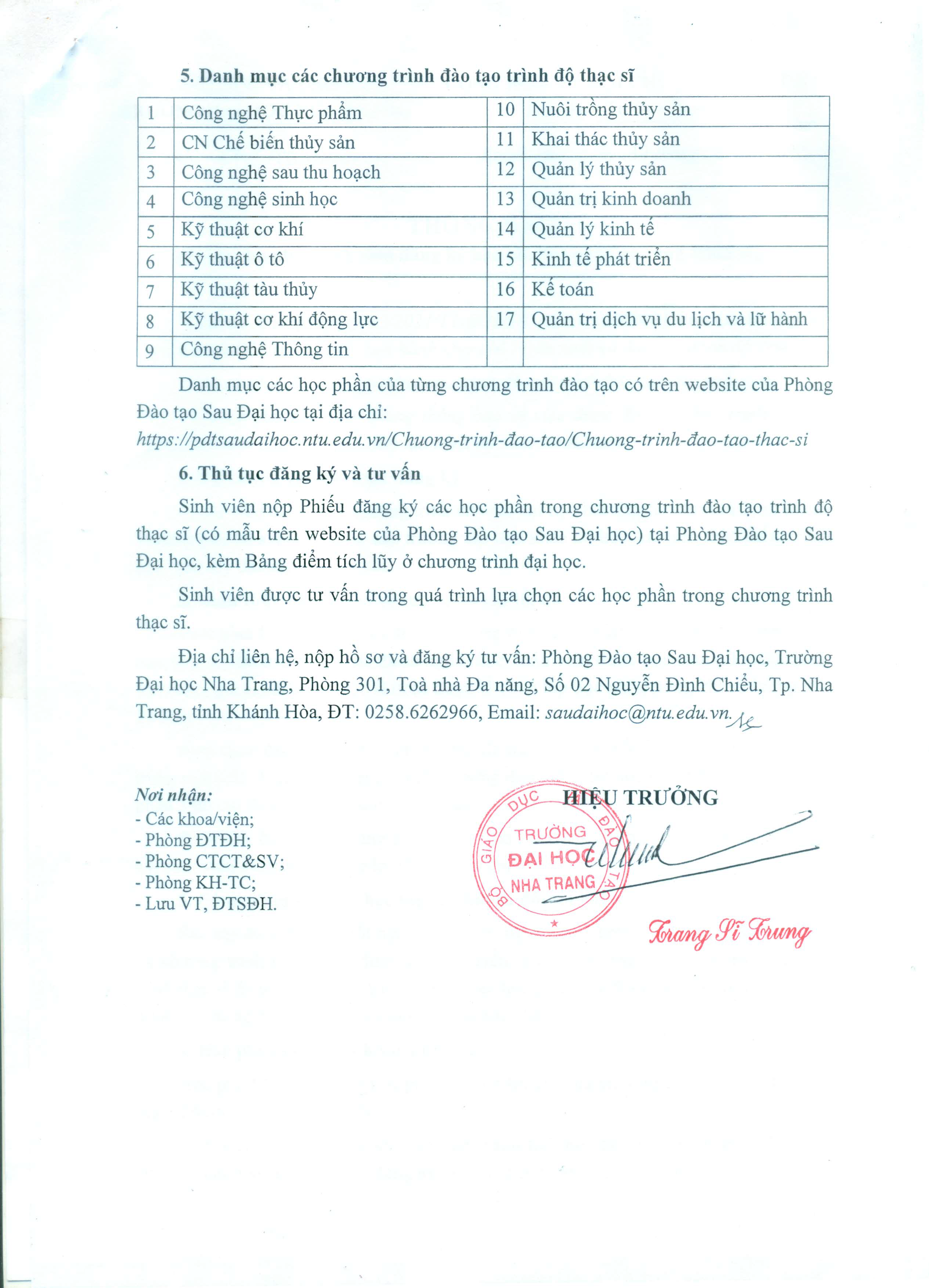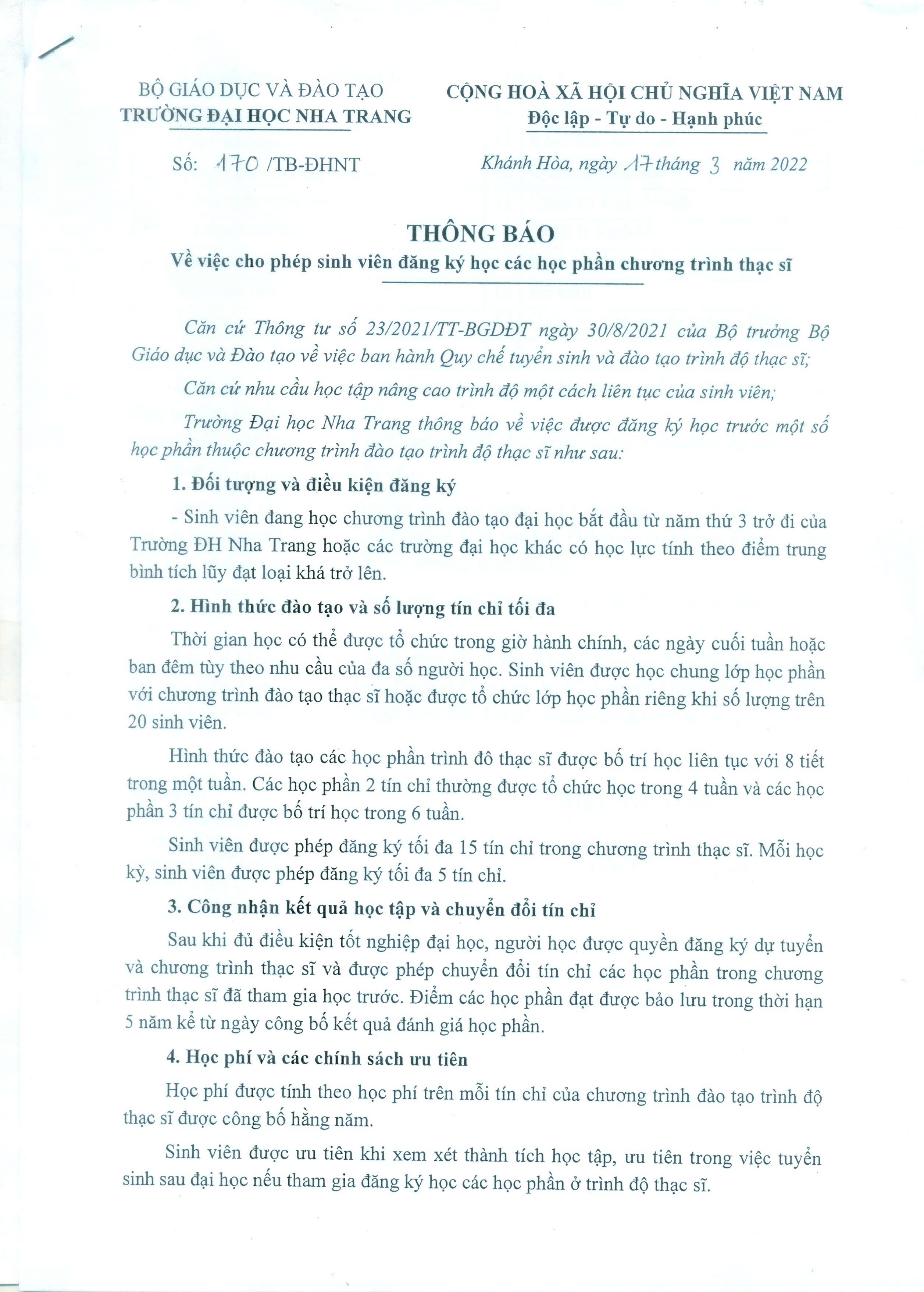 Trường Đại học Nha Trang thông báo về việc cho phép sinh viên đăng ký học các học phần chương trình Thạc sĩ.