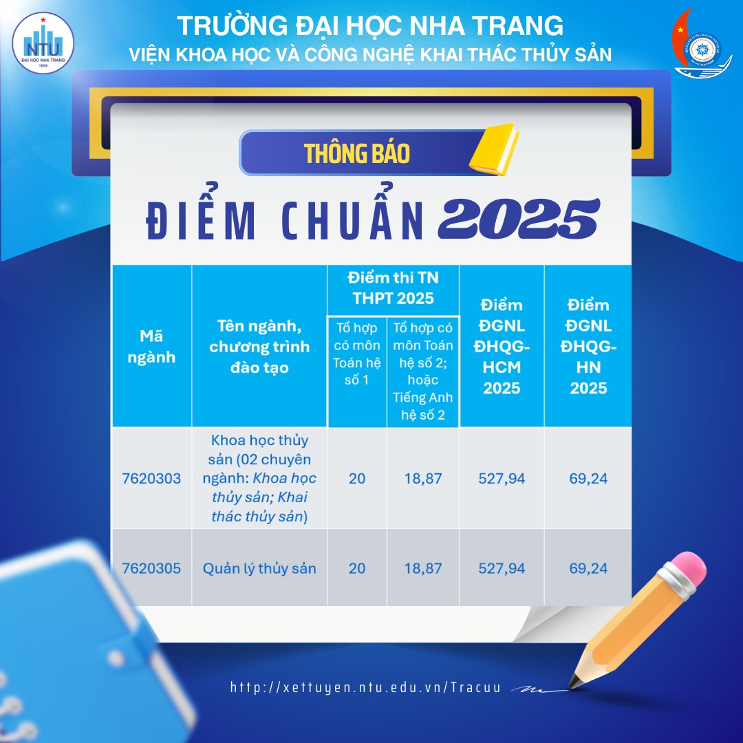 Viện Khoa học và Công nghệ Khai thác Thủy sản - Trường Đại học Nha Trang xin thông báo điểm chuẩn năm 2025 với 02 ngành đào tạo Đại học chính quy như sau: